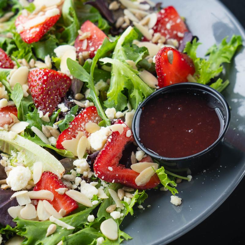 Spring greens, strawberries, almond slivers, sunflower seeds, and feta cheese.